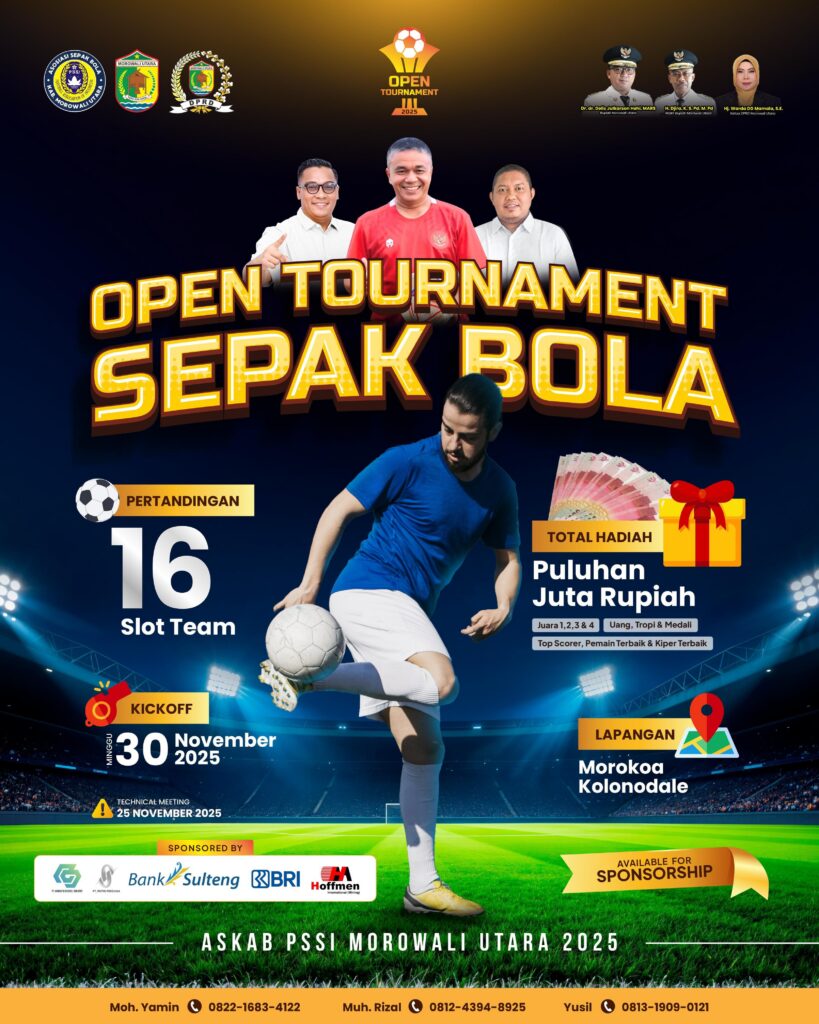 Morowali Utara – Open Turnamen Sepak Bola ASKAB PSSI Morowali Utara 2025 resmi mencatat antusiasme tinggi setelah seluruh kuota peserta terpenuhi. Sebanyak 16 tim yang berasal dari Morowali Utara dan sejumlah daerah tetangga telah menyatakan kesiapan mengikuti turnamen yang dijadwalkan berlangsung pada Desember 2025 di Lapangan Morokoa, Kolonodale.
